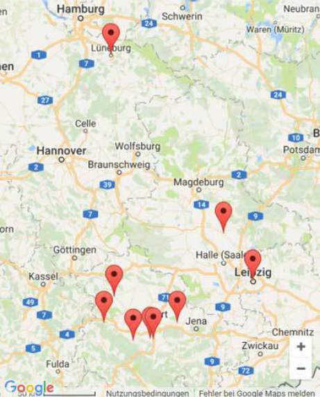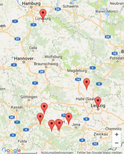 Neun Bachstädte und Bachorte sind es, die im Leben des Johann Sebastian Bach eine bedeutende Rolle spielten. Denn dort hat er gelebt, gewirkt, gelernt oder wenigstens geheiratet. © Google Maps.