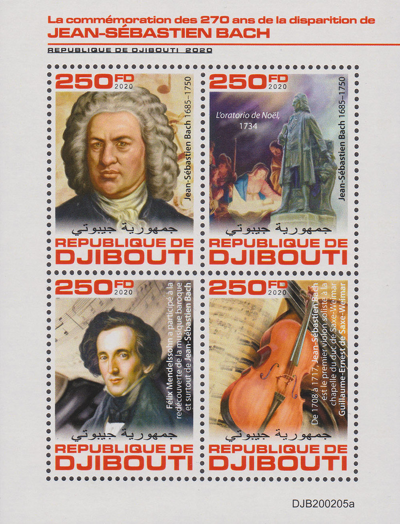 2020 wird dieser Block in Dschibuti emittiert. Es ist der 270. Todestag von Johann Sebastian Bach..