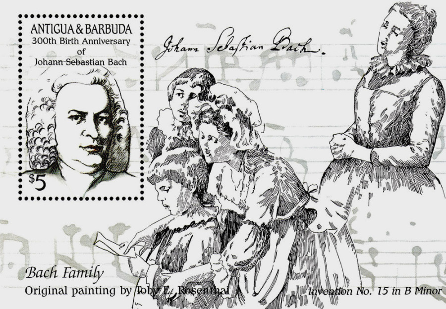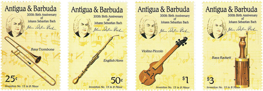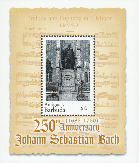 Sechs Briefmarken insgesamt gab der Karibik-Staat Antigua & Barbuda zu Feiertagen in Johann Sebastian Bachs Leben heraus. Dies sind die fünf Marken oben, die zum 300. Geburtstag des Komponisten im Jahr 1985 erschienen. Und es ist die Marke mit dem Bach-Denkmal in Leipzig, unten, im Jahr 2000. In dieser letztgenannten Marke ist im gelben Randbereich das Werk „Prelude und Fughetta in E Minor“, das katalogisierte BWV-Stück 900 abgebildet. Und weil es eine deutsche Homepage ist, das Ganze hier auch noch deutsch: Es handelt sich um das „Präludium und Fughetta e-Moll“. Die Werksnummer ... sie ist natürlich dieselbe. Danke für die Info, Paul Gomon..