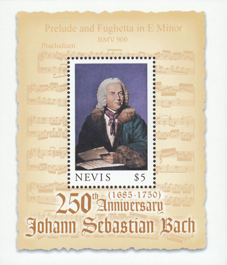 2000 Nevis. Diese Johann-Sebastian-Bach-Briefmarke ist eine richtige Schönheit und Sie sollten nicht eine Sekunde zögern, um sie bei Flickr in höherer Auflösung und größer zu bewundern. Die Details sind atemberaubend..