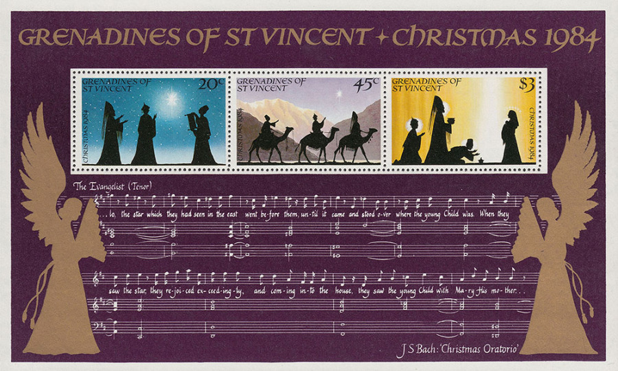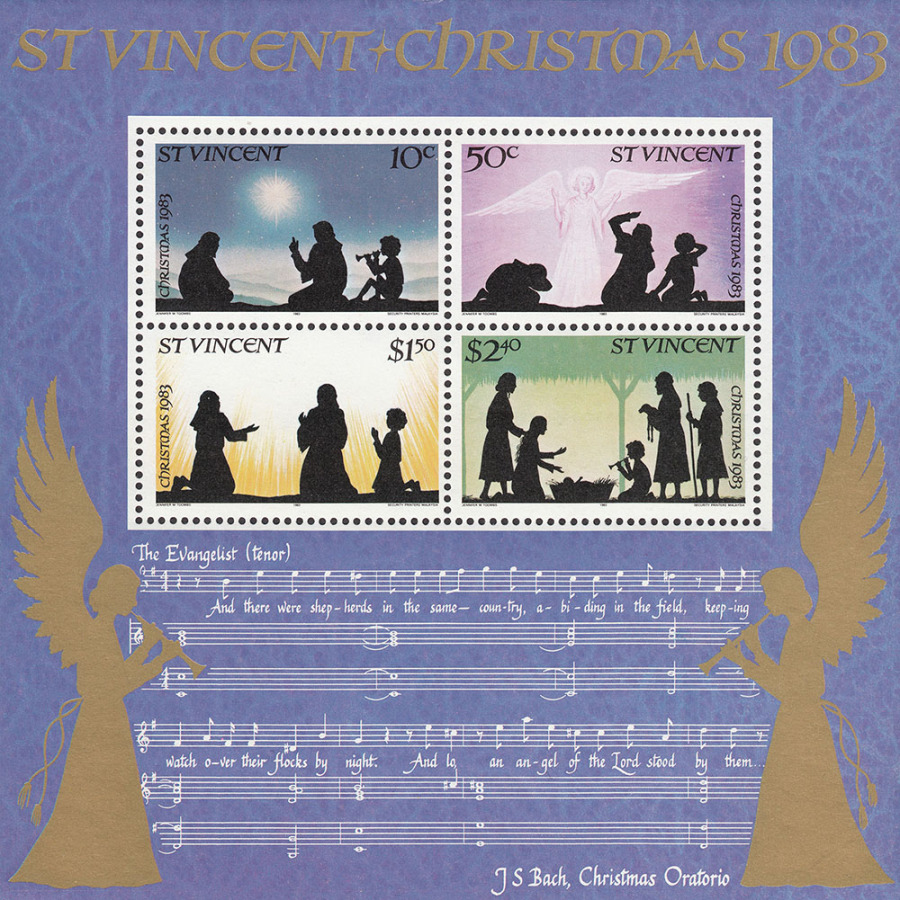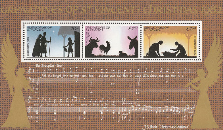 Die Weihnachtsausgabe einer Bach-Briefmarke (... unten). Vier Motive in einem Block. Der Nennwert der 1983 herausgegebenen Marke ist 1 ostkaribische Dollar und 50 Cent. Dazu 2 $ 40 Cent, sowie 50 Cent und 10 Cent. Unter den Briefmarken sieht man Text und Noten des „Weihnachtsoratorium“, das die BWV-Nummer 248 hat. Und wer weiß das so genau? Richtig. Musikwissenschaftler Paul Gomon..