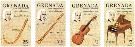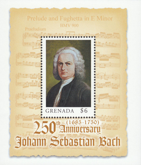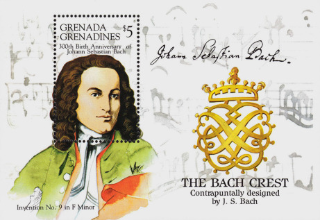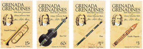 Wie ist das jetzt mit der Emittentin der Marke unten? Ist es „Grenada und die Grenadines“? Oder ist es wie bei der Ausgabe der nördlichen Nachbarinsel? Geht es hier um die Inseln, die sich „Grenadines“ nennen und zu Grenada gehören? Eigentlich ... ist es egal: Die Marke mit dem berühmten Bach-Siegel ist wunderschön, das Porträt stellt Bach in seiner Zeit in Arnstadt dar. Und die Noten sind aus der „Invention Nr. 9 in f-Moll“. Die Instrumente: eine Trompete, eine Bassgambe, eine Flöte und ein Doppel-Flageolett. Hätte ich's gewusst? Im ganzen Leben nicht. Danke Herr Gomon aus Leipzig. Anlass ist der 300. Geburtstag im Jahr 1985.