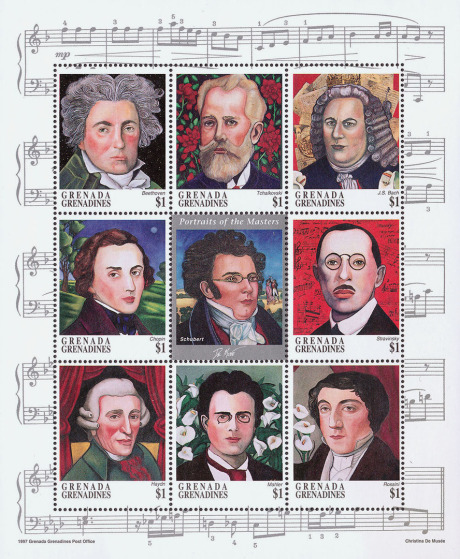 Unten: Eine „Kleinbogenausgabe“ nennt man es philatelistisch. Und wenn man in St. George's schon nicht vorhatte, die Komponisten auf den Briefmarken in deren Bedeutung aufzulisten und auch nicht alphabetisch, so hat man sich doch wenigstens entschlossen, allen den gleichen Nennwert von einem ostkaribischen Dollar zu geben. Von oben links nach unten rechts, so wie wir das in der Schule gelernt haben, sind folgende Musiker als Briefmarken verewigt: Beethoven, Tschaikowski, Bach, Chopin, Schubert, Strawinsky, Haydn, Mahler und Rossini. Die Briefmarken wurden 1997 veröffentlicht..