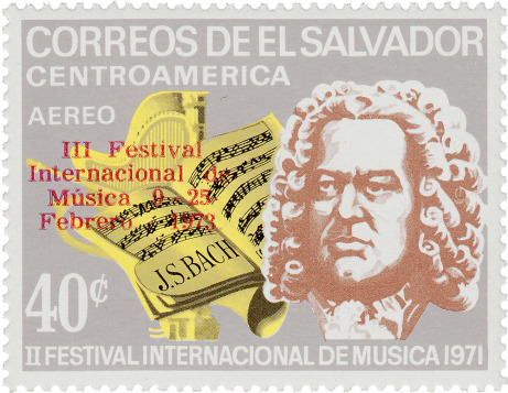 Es gibt zwei fast identische Bach Briefmarken aus El Salvador: und zwar zur zweiten und zur dritten Internationalen Musikwoche. 1971 ohne roten Eindruck. 1973 dann mit. Der Nennwert von beiden: 40 Centavos. 100 wären ein Colon..