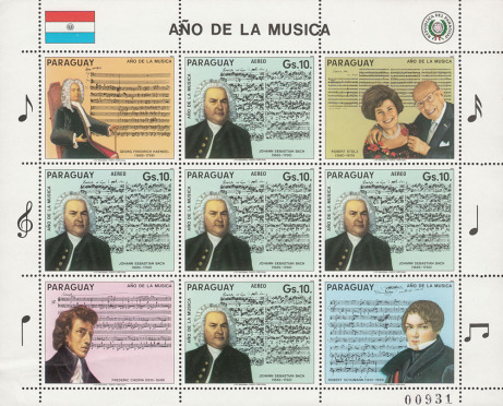 Als Nächstes ist es noch eine Bach-Briefmarke aus Paraguay. Zum „Jahr der Musik“ und anlässlich des 300. Geburtstages von Johann Sebastian gibt das Postministerium von Paraguay 1985 den folgenden Kleinbogen heraus. Neben Bach ehrt dieser die Komponisten Georg Friedrich Händel, Robert Stolz, Frédéric Chopin und Robert Schumann. Hinter den Motiven der Künstler sind jeweils Noten aus deren Werken abgebildet. Die von Johann Sebastian gehören zum „Wohltemperierten Klavier“..