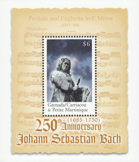 Die folgende Bach-Briefmarke haben Sie ebenfalls ähnlich gerade eben schon gesehen: Zwei Karibik-Staaten geben nämlich diese Marken zu Ehren Johann Sebastians 250. Todestag heraus. Der Teil in der Mitte ist verschieden. Der äußere Rand ist der gleiche. Der Nennwert? $ 5. Das Erscheinungsjahr? 2000. Im Randbereich wieder das Werk „Präludium und Fughetta in e-Moll“..