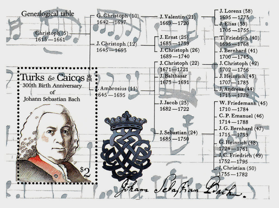 Zum 300. Geburtstag des Komponisten aus Thüngen geben die Turcs- und Caicos-Inseln die fünf Briefmarken oben heraus. Der Stammbaum ist ein Auszug, der vom Großvater Johann Sebastians, im „Ursprung“ die Nr. 5, bis hin zu Johann Sebastians Söhnen reicht. Die Nummern in Klammern beziehen sich auf den sogenannten „Ursprung“. Es ist eine Zusammenstellung fast alle Musiker in der Familie Bach, die JSB 1735 selber erstellte, als er 50 Jahre alt war..