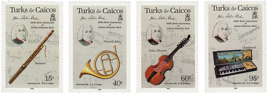 1985 Turks und Caicos Islands. Im Block oben gibt es in der rechten Hälfte ein wenig Bach-Genealogie. Darunter sind die vier Instrumente Fagott, Naturhorn, Viola d'Amore und ein Klavichord. Von mir als fast ausschließlichem Musik-Hörer wieder ein Dankeschön an Paul Gomon für diese viele, spannende Information. Er ist Musikwissenschaftler, Autor und Bach-Briefmarken-Sammler..