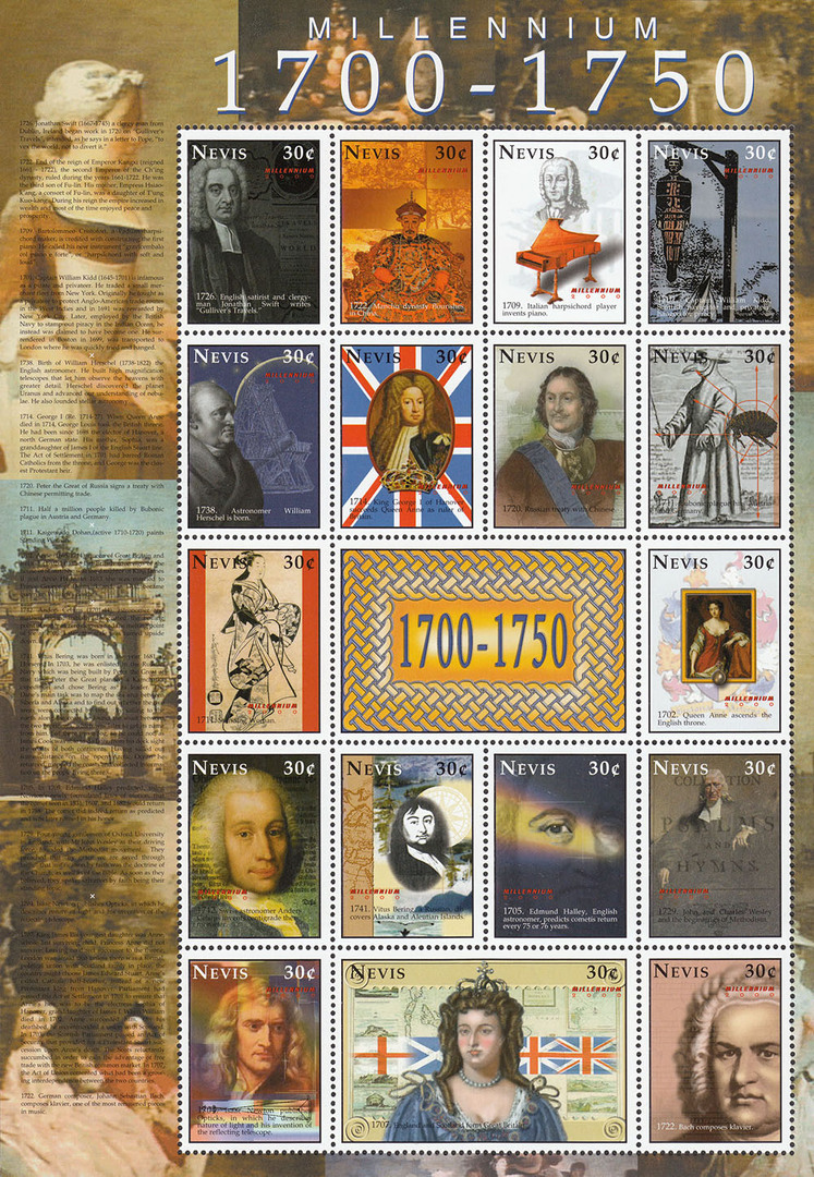 Die zweite Johann-Sebastian-Bach-Briefmarke ist Teil eines riesigen, wunderschönen Blocks zum Jahrtausendwechsel. Die Bach-Marke hat einen Nennwert von 30 ostkaribischen Cent. Der Block zeigt bedeutende Ereignisse sowie Personen zwischen den Jahren 1700 und 1750. Die Marke bezieht sich dabei auf das von Bach komponierte „Wohltemperierte Klavier“, genauer den ersten Teil. Dankeschön nach Leipzig, an Sie, Herr Gomon..