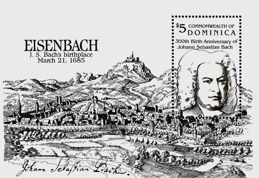 Zum 300. Geburtstag gibt Dominica diese wunderschöne Marke unten heraus, wie weitere Karibik-Staaten ähnlich. Dazu vier zusätzliche Marken in vollkommen anderem Stil. Unten links im Bild sieht man auch die Unterschrift Johann Sebastians. Die Abbildung von Eisenach ist nach einem Merian-Stich angefertigt..