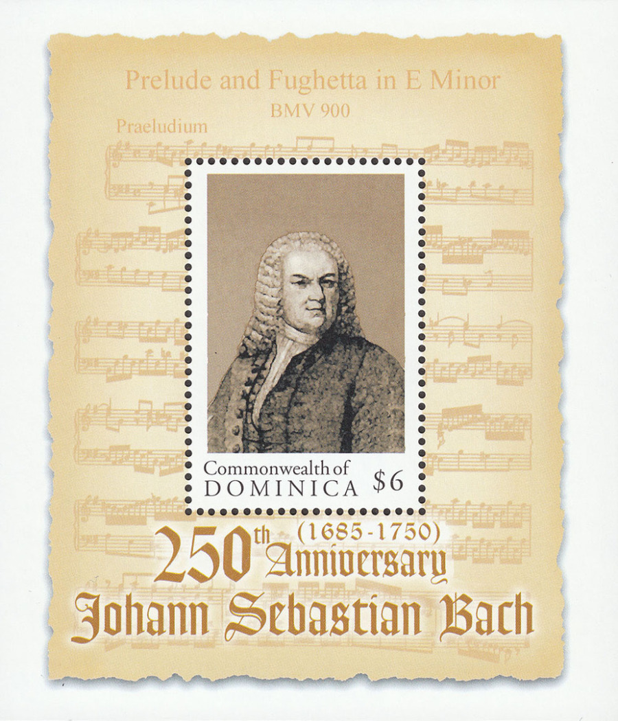 Am 250. Todestag gibt Dominica ebenfalls eine Marke heraus (... unten), die im Design anderen Marken aus der Karibik gleicht. Auch der Anlass ist derselbe. In der Mitte ist Bach nach einer Lithografie von Maurin, Paris 1822 dargestellt. Für die Info herzlichen Dank an Paul Gomon..