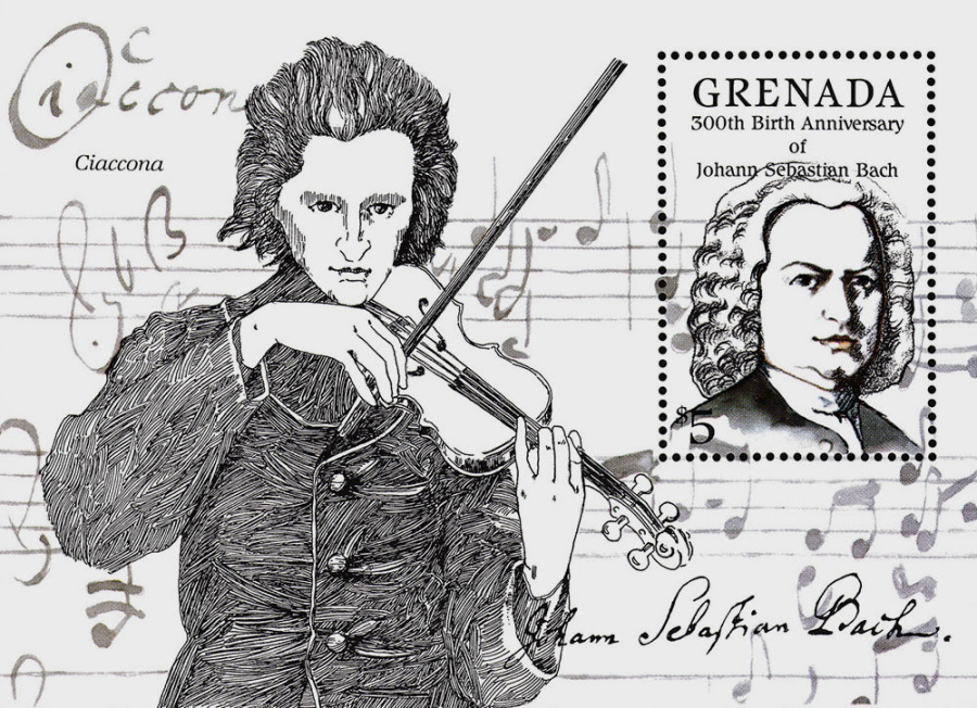 Also emittiert die nächste Bach-Marke „nur“ Grenada? Und keine der Grenadinen? Eben nicht die Grenadinen, in Landessprache „Grenadines“, die zwischen Grenada im Süden und St. Vincent im Norden liegen. Nur Grenada. Mit einem Schmunzeln. Zum 300. Geburtstag zeigt diese Briefmarke unten, die große, Bach als 18-Jährigen am Weimarer Hof - als Geiger. Die Instrumente auf den kleinen Marken sind von links nach rechts Krummhorn, Oboe, Violine, Cembalo. Die Noten im Hintergrund: ein „Chaconne aus der Partita Nr. 2 d-Moll“. Und nebenbei ist es das Werk 1004 im Bach-Werke-Verzeichnis. Wo habe ich es abgeschrieben? Bei Paul Gomon. Wäre ich über kurz oder lang auch selber darauf gekommen? Nein.