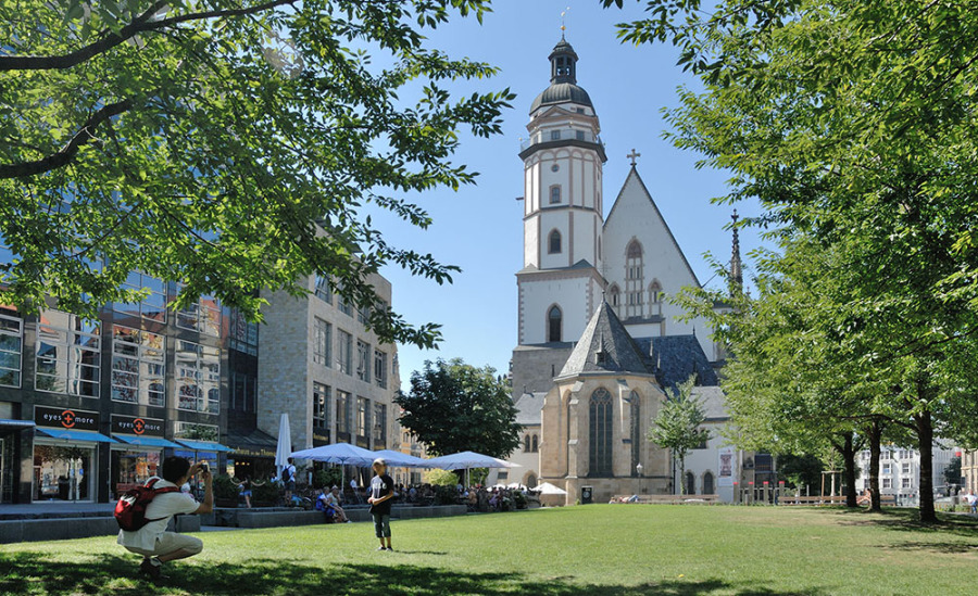 מפורסם בכל העולם בזכות יוהאן סבסטיאן באך: כנסיית סנט תומאס. בצד שמאל - לא נראה כעת - נמצאת האנדרטה החדשה של באך בחצר הכנסייה של סנט תומאס. 50 צעדים קדימה, גם קרוב מאוד לכנסיית סנט תומאס, נמצאת אנדרטת באך העתיקה.