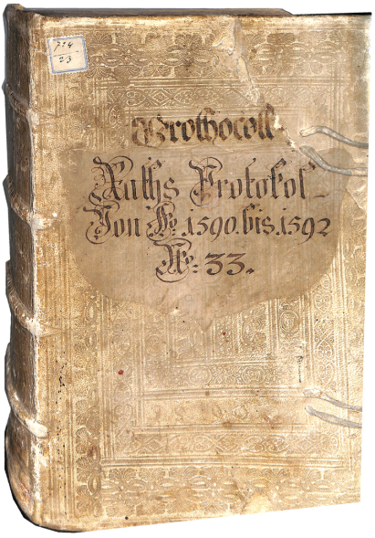 Das ist es, das uralte Protokoll ... besser der historische Band mit Einträgen des Rats der Stadt Laa an der Thaya. In ihm ist Veit Bach erwähnt. © Dieses Motiv hat mir Herr Lehner freundlicherweise zur Publikation zur Verfügung gestellt..