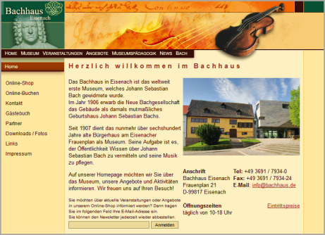 Natürlich ganz weit oben: die Homepage des Bachhauses in Eisenach. Heute mit dem top-modernen Bach-Museum gleich nebenan. Hier kann man Bach kennenlernen. Hier kommt man Johann Sebastian besonders nahe. Und wenn denn ein Besuch in Eisenach oder noch besser, unter anderen Bach-Orten, in Eisenach, geplant ist, dann ist man auf der Webpräsenz des Bachhauses bereits vorher richtig gut „unterwegs“. Man erfährt ein wenig von allem. Alles ist dort natürlich viel, viel vernünftiger als auf meinen Homepages präsentiert. Seriös eben. Eigentlich will ich Ihnen ja hier über den Besuch der Website hinaus eine „unvirtuelle“ Reise schmackhaft machen. Also, ich meine ... dass Sie „so richtig selbst hinfahren“ und dort alles erleben. Und nicht am PC. Dazu ist die Homepage der Bach-Einrichtung wirklich ein guter Start. Dort - mit Ihrem Ausflug - tauchen Sie dann so richtig in die Welt des Komponisten Johann Sebastian Bach ein. In seine Musik, in sein Leben, in seine Philosophie..