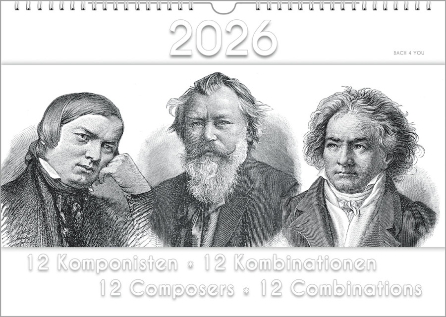 Etwas Besonderes: Es ist jeweils ein großes, cooles, junges Porträt von Johann Sebastian Bach. Dazu gibt es dann jeweils ein kleineres, historisches Porträt von einem bekannteren historischen Künstler dazu. Dieser Kalender spricht ganz sicher nur sehr wenige Bach-Lover an..